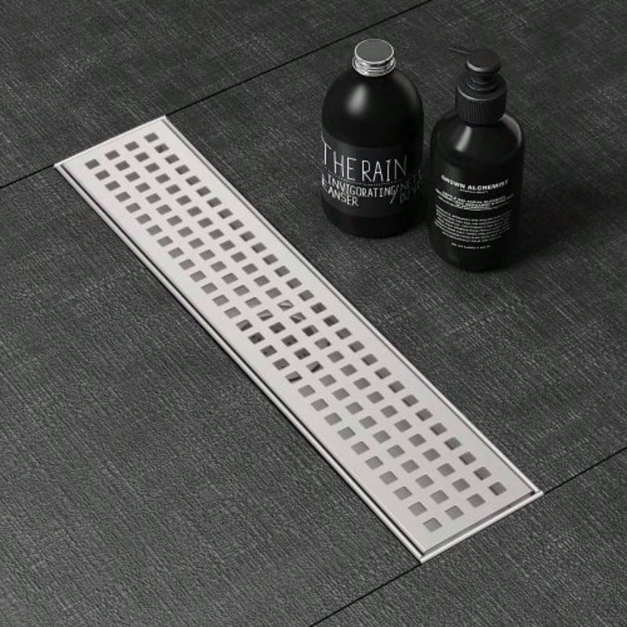 12 Inch Linear Shower Drain with Removable Quadrato Pattern Grate Cover, 304 Stainless Steel Shower Floor Drain with Hair Strainer and Leveling Feet