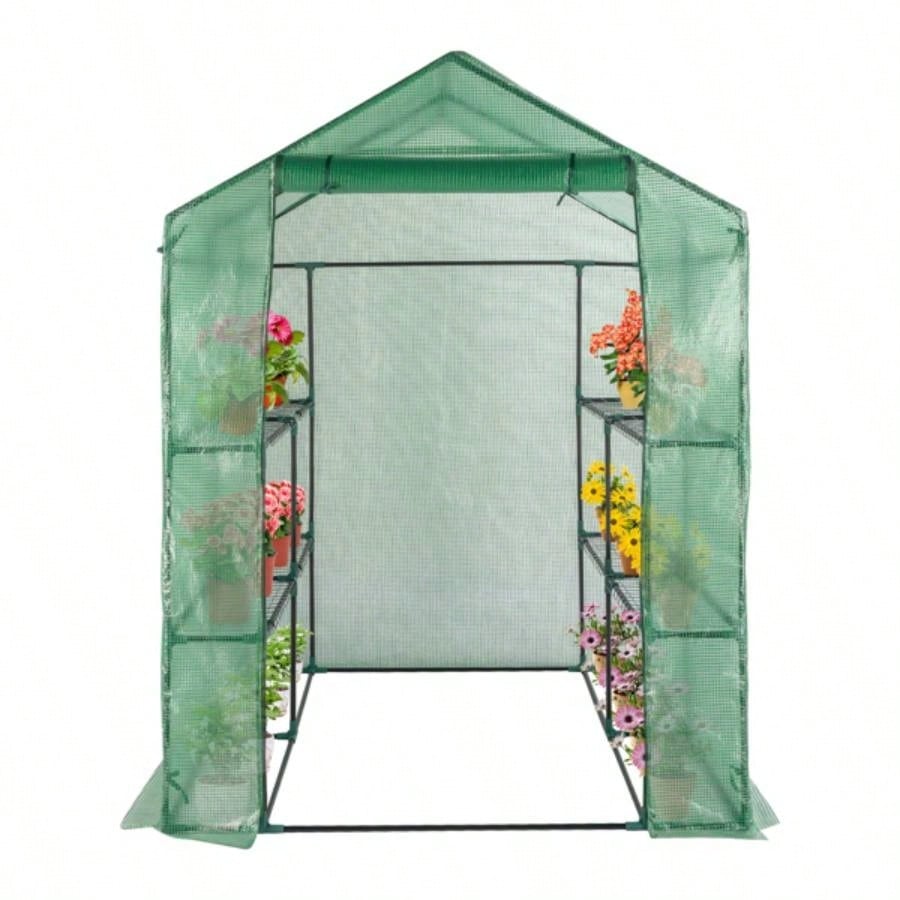143x143x195cm Black Iron Pipe Steeple With 8 Pieces Grid Flower Stand With Zipper Rolling Door PE Cloth Greenhouse