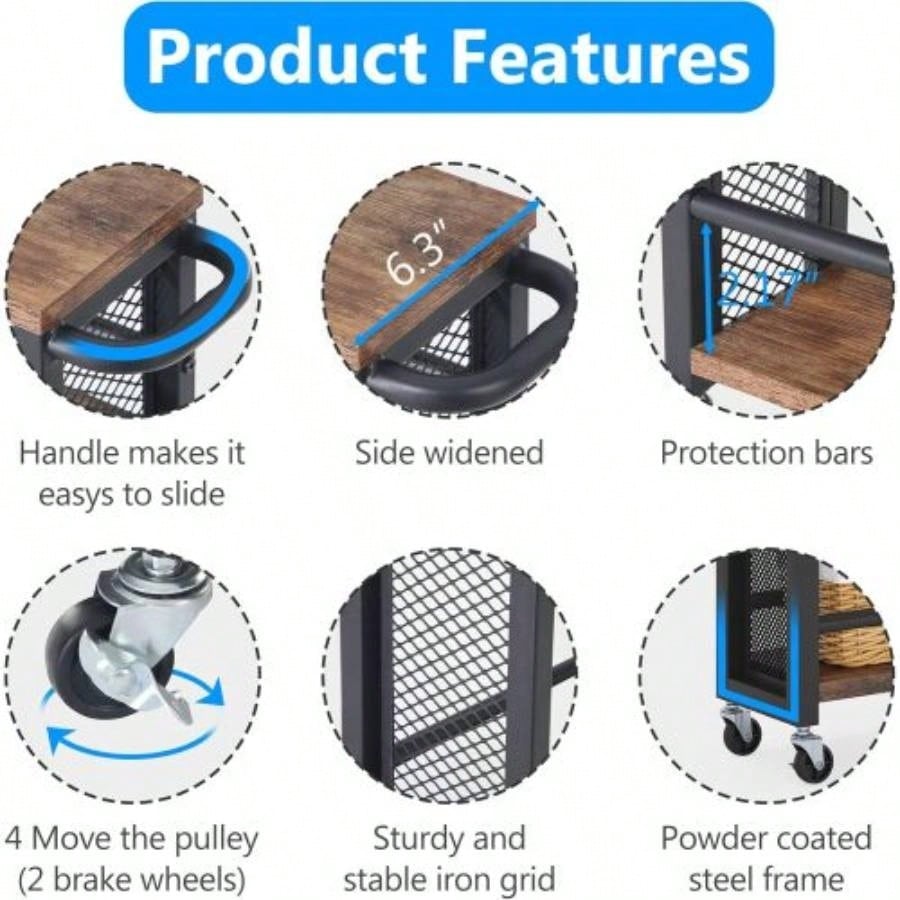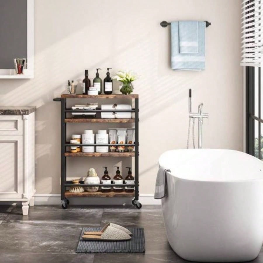 20 Slim 4 - Tier Rolling Utility Cart with Wheels, Narrow Kitchen Storage Trolley Small Spaces, Wood and Metal Spice Rack Organizer, Mobile Shelving Unit Pantry, Bathroom - Brown Black