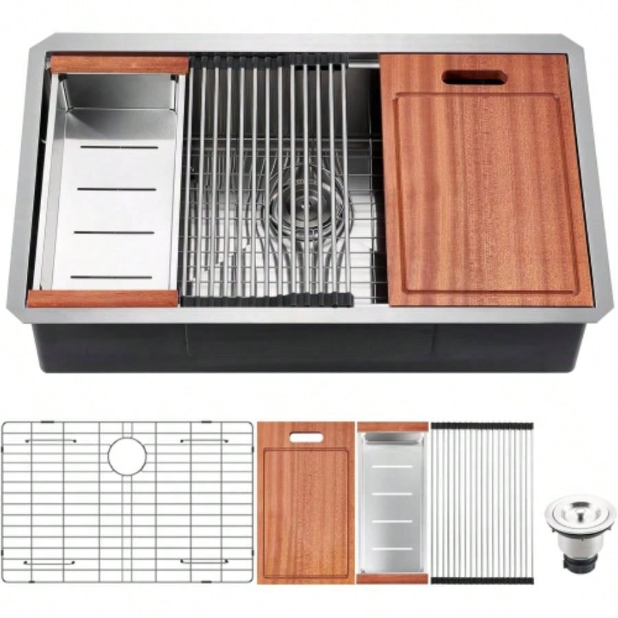 32x 18 inch Undermount Workstation Sink, Stainless Steel Single Bowl Kitchen Sink 18 Gauge