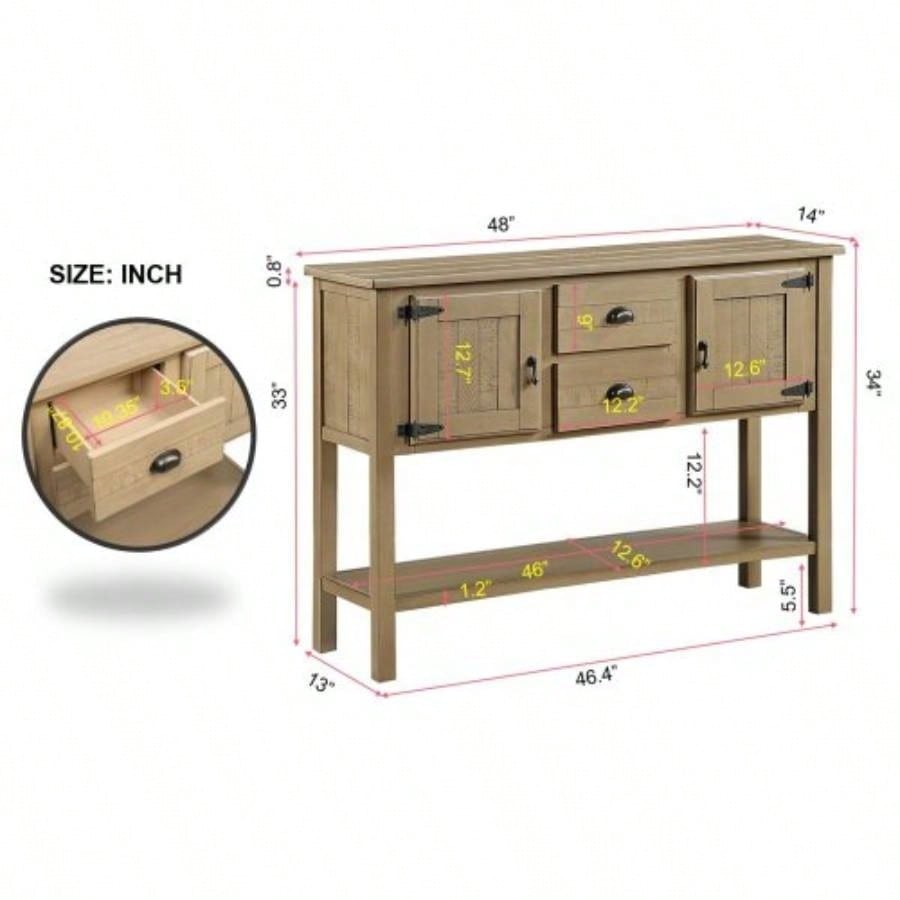 48 Solid Wood Sideboard Console Table with 2 Drawers and Cabinets and Bottom Shelf, Retro Style Storage Dining Buffet Server Cabinet Living Room Kitchen Dining RoomRustic