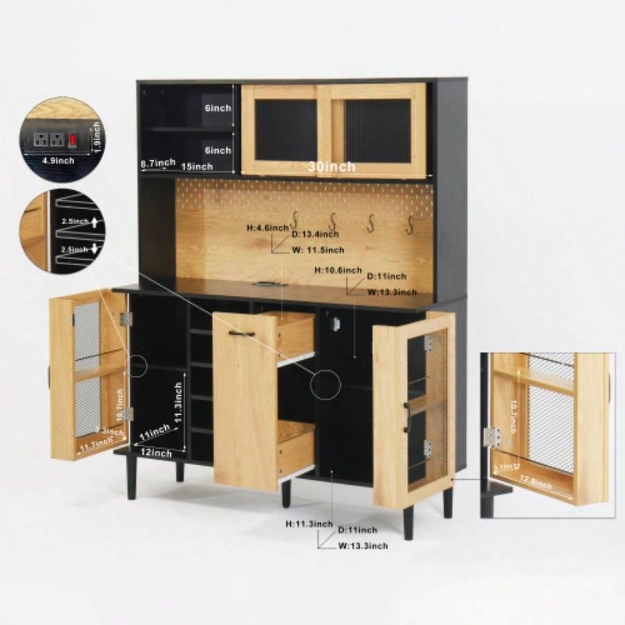 59 H Buffet Sideboard Cabinet with Storage Door Power Outlet, Farmhouse Coffee Bar Cabinet with Wine Rack, Kitchen Pantry Living Room BlackNatural