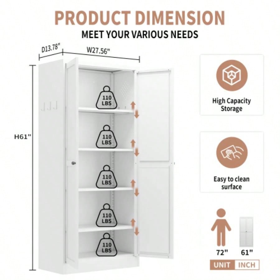 61 White Metal Kitchen Pantry Cabinet Adjustable Storage with 4 Shelves 110lb Capacity Heavy Duty Freestanding Pantry Organizer Kitchen, Pantry, Living Room