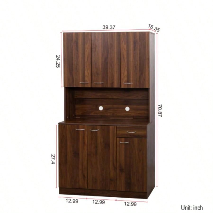 70.87 Tall Wardrobe Kitchen Cabinet, with 6 - Doors, 1 - Open Shelves and 1 - Drawer bedroom, Walnut