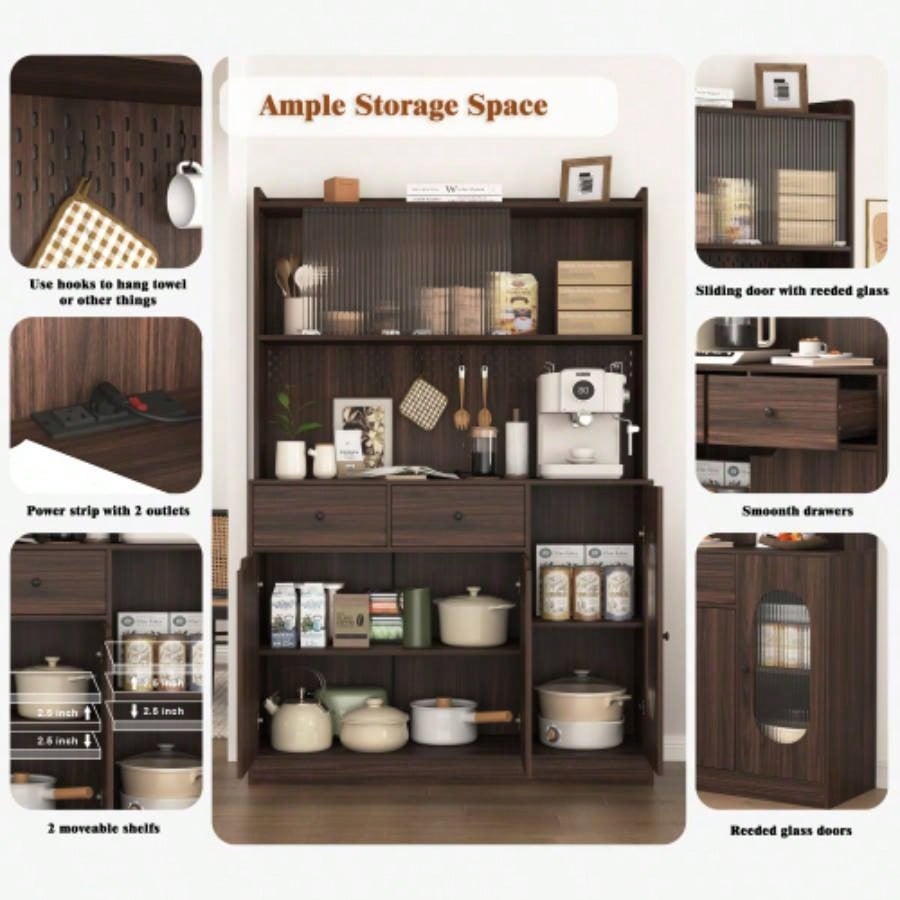 71Tall Kitchen Pantry Storage Cabinet, Large Capacity Display Cabinet with Reeded Glass Doors and Microwave Stand, Bakers Racks with Storage Kitchens, Pantry, Living Room