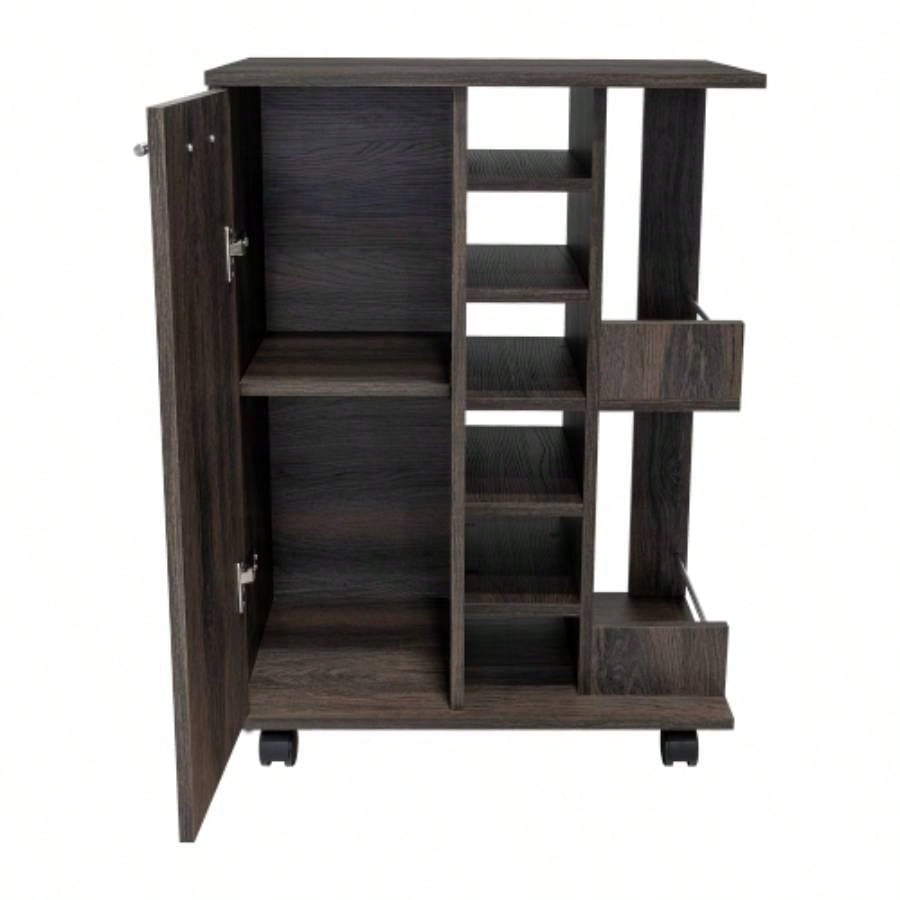 Bar Cart, Two External Shelves, Four Casters, Six Built - in Wine Rack, Single Door Cabinet - Espresso