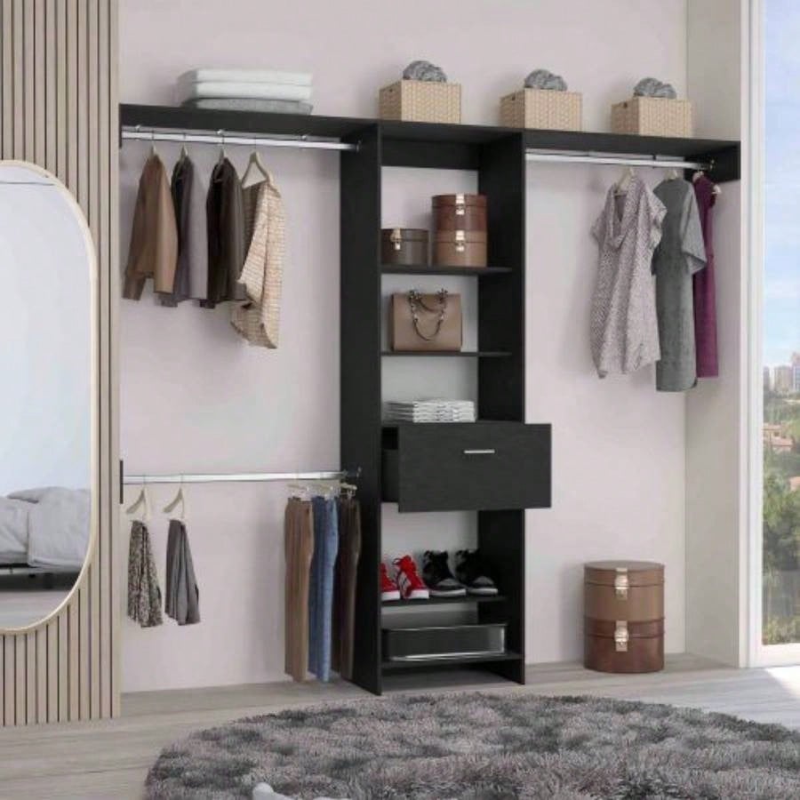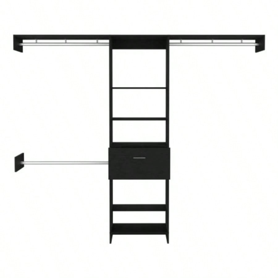 Closet System, One Drawer, Three Metal Rods, Five Open Shelves, Black