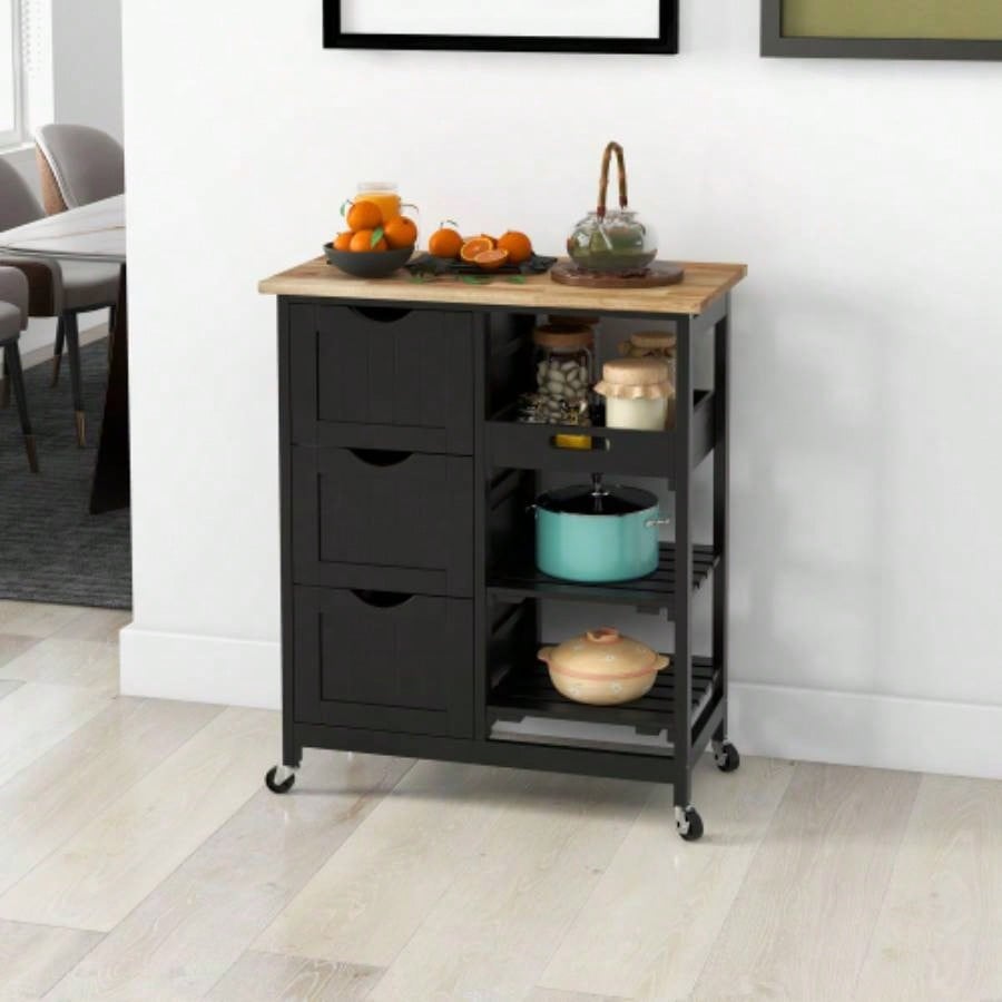 HOMCOM Rolling Kitchen Island Cart, Bar Serving Cart, Compact Trolley on Wheels with Wood Top, Shelves Drawers Home Dining Area, Black