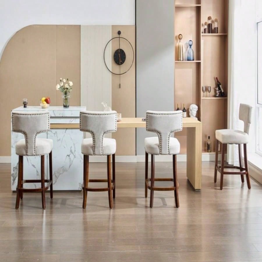 Mid Modern Counter Height Bar Stools Set of 2, Farmhouse Linen Fabric Upholstered Accent Chair Curved Backrest with Copper Nails around, Kitchen Chairs with Hardwood Frame, Beige
