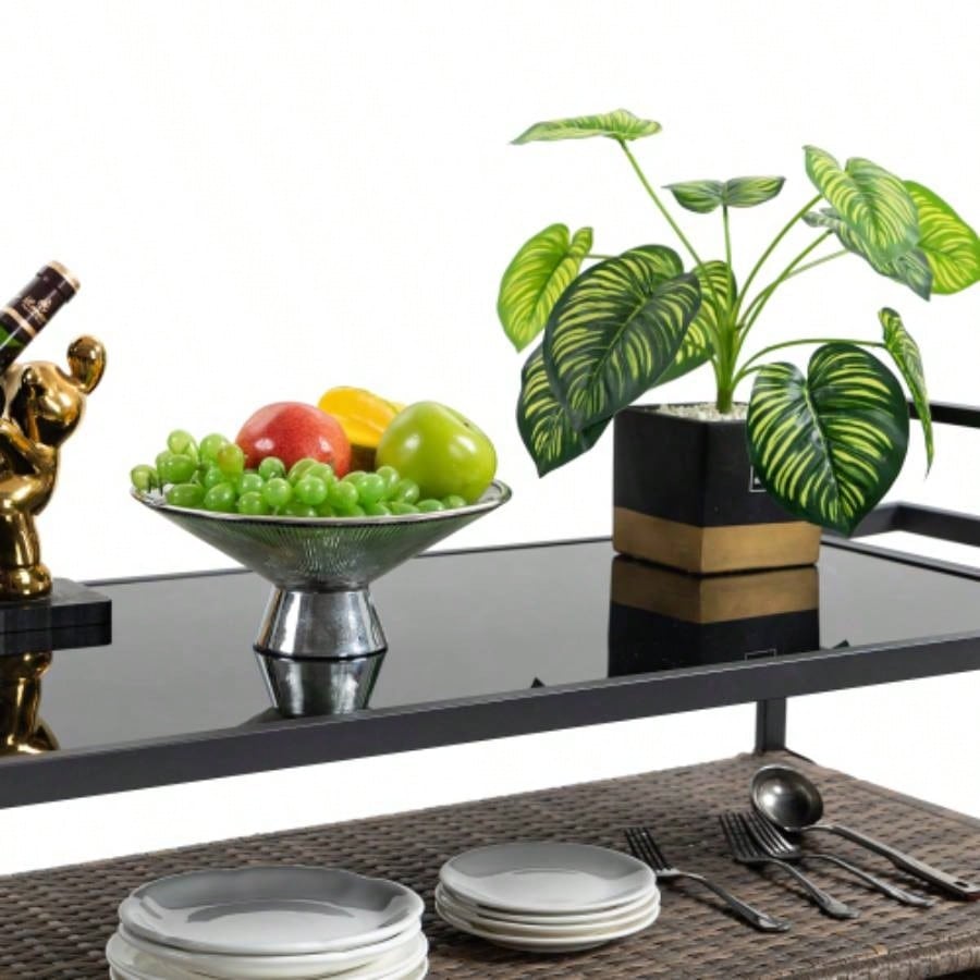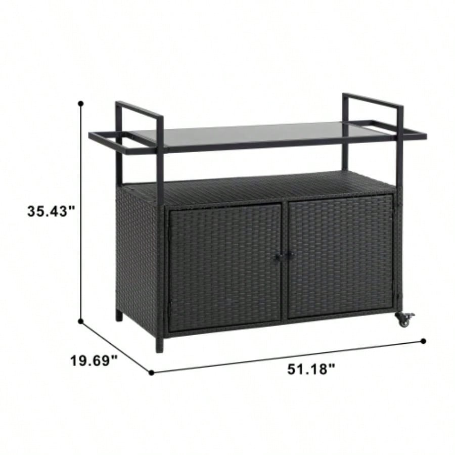 Outdoor Wicker Bar Cart, Patio Wine Serving Cart/Wheels, Rolling Rattan Beverage Bar Counter Table/Glass Top Porch Backyard Garden Poolside Party, Light brown