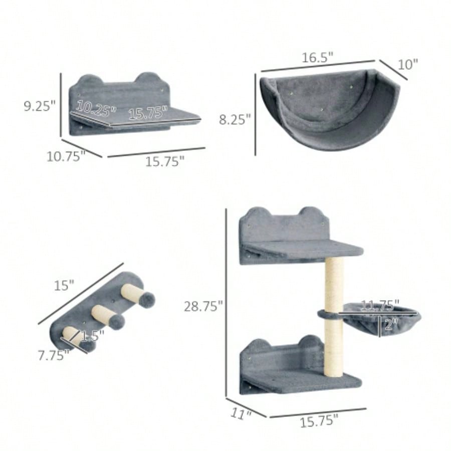 PawHut Wall Shelves, 4 Pcs Wall Furniture Climbing Shelf with Hammock, 3 Steps, Perches, Scratching Post, Sleeping, Playing, Gray
