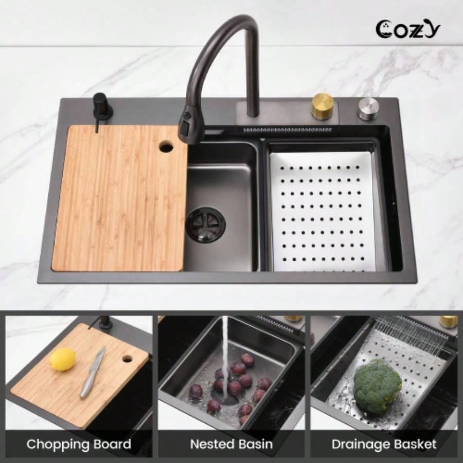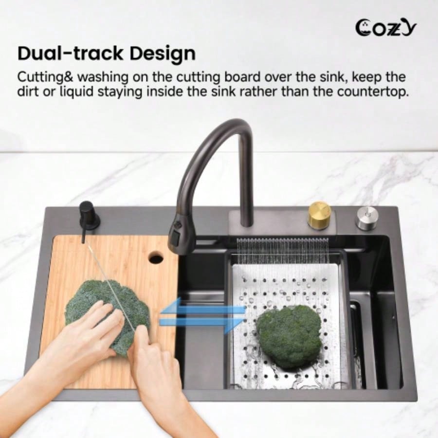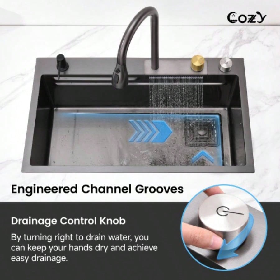 Waterfall Kitchen Sink, Stainless Steel Single Bowl in Black, Multifunctional Workstation with Flying - rain Faucet and Cutting Board, 3022 Stainless Steel Single Bowl Sink, SSBL12